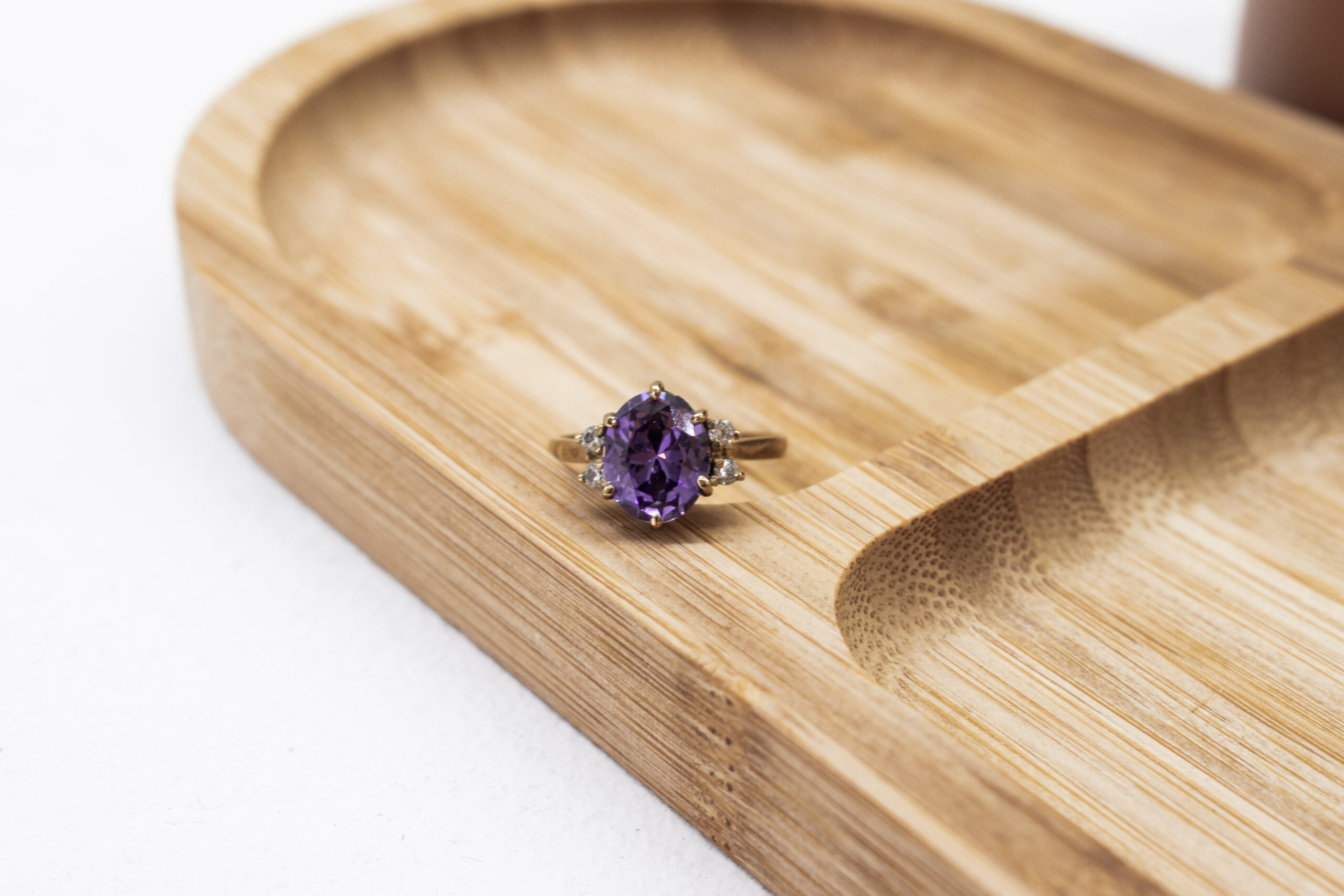 Anillo de dama, en oro 12 kilates con cuatro Circonias engarzadas y una Amatista.