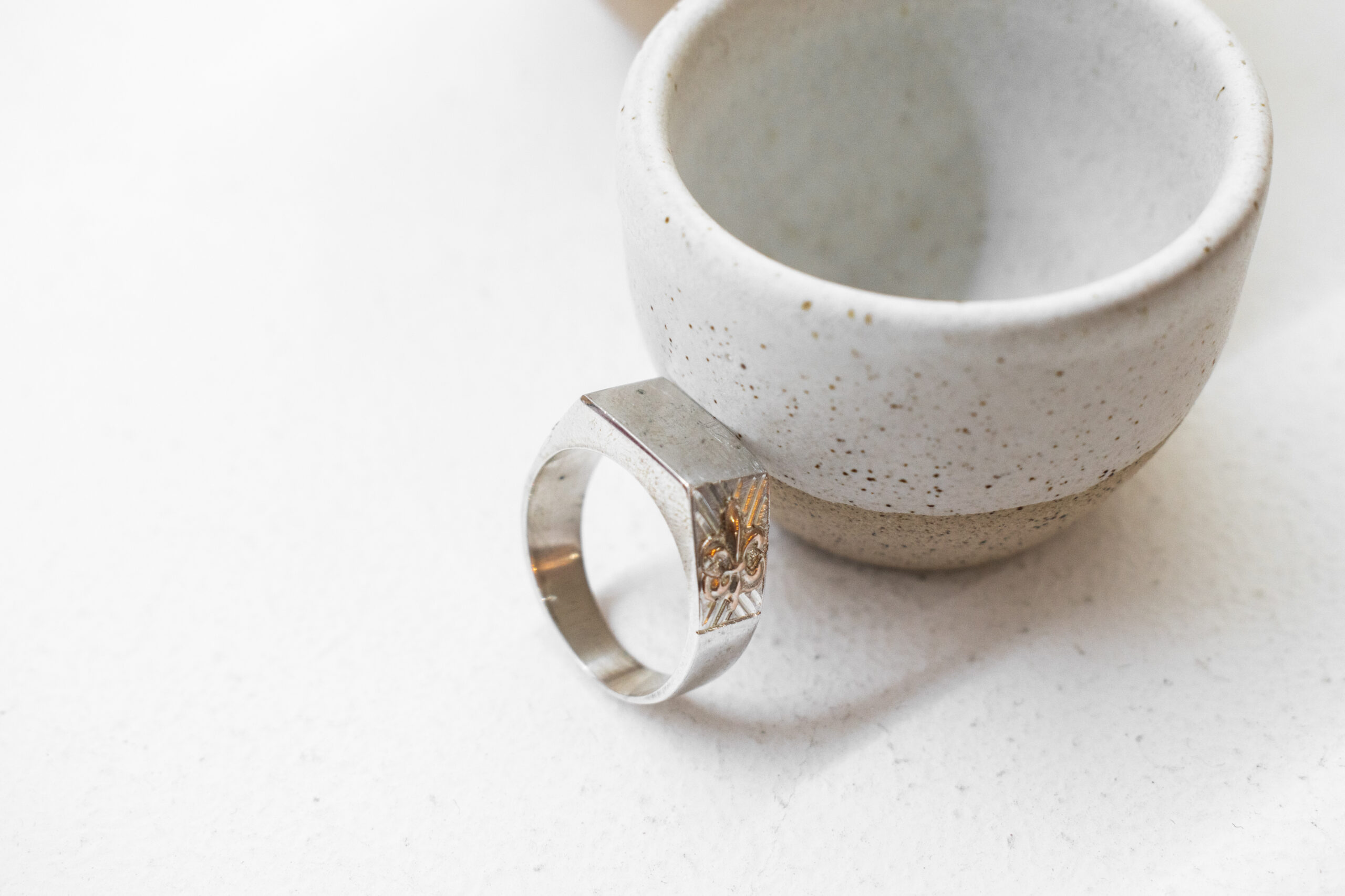 Anillo de plata con mesa rectangular y apliques de oro hacia los costados, para dama o caballero.