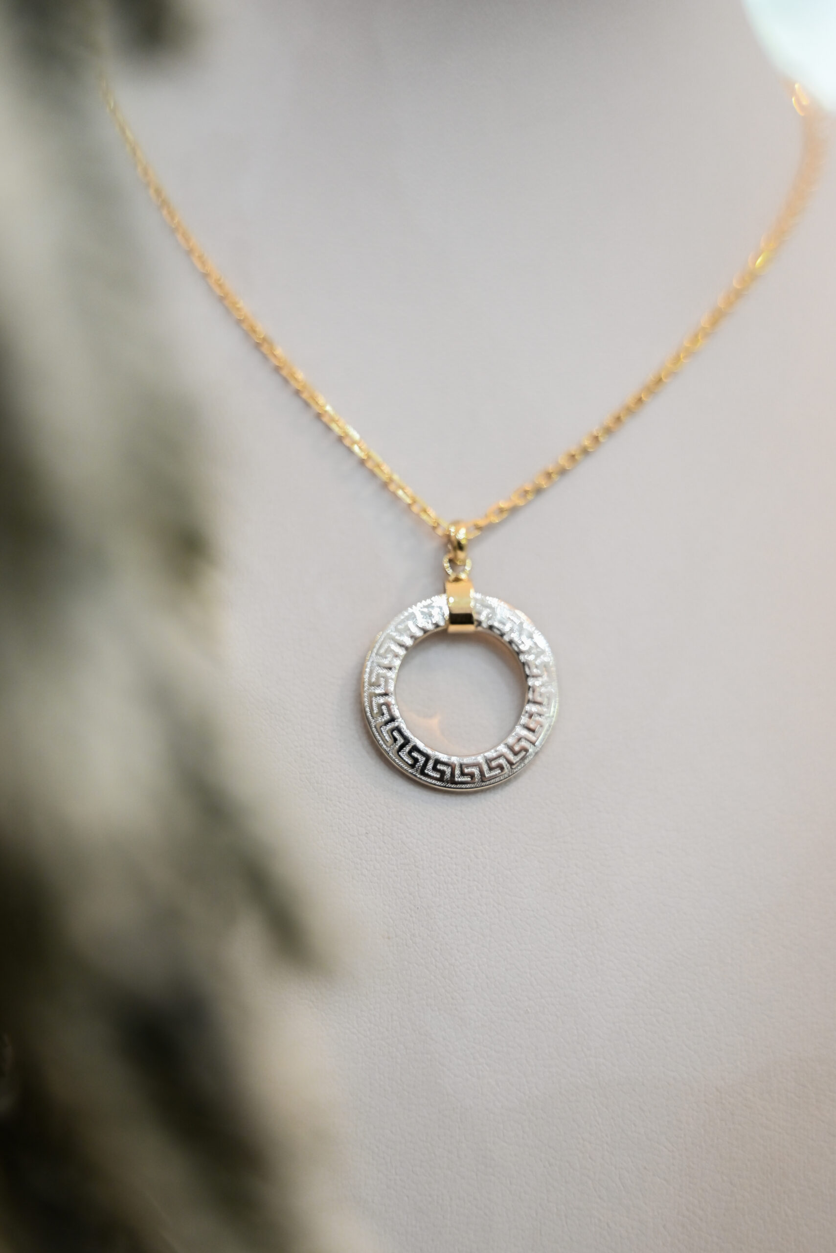 Cadena fina de oro 12 kilates + colgante circular con motivo de guarda griega en plata y oro.