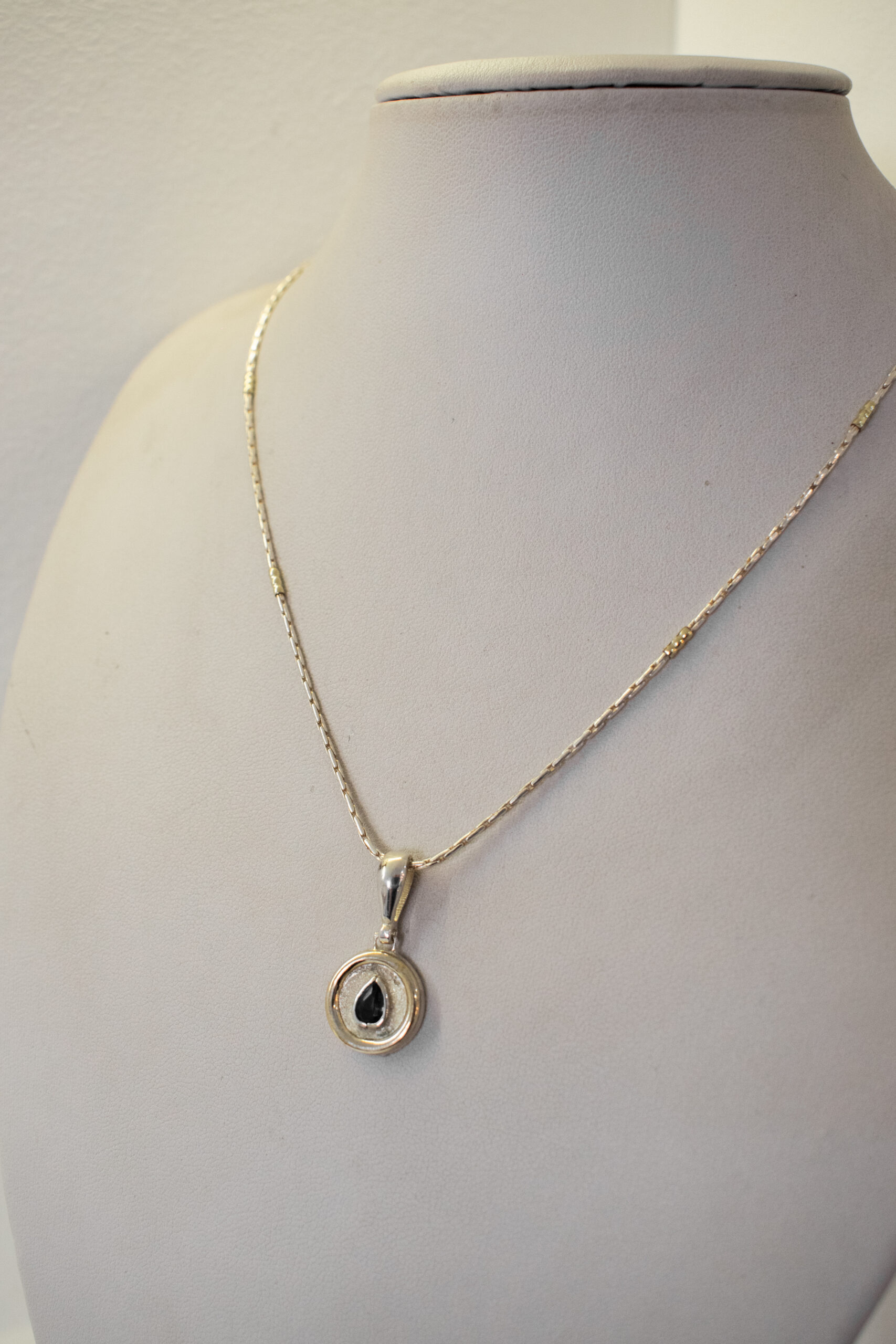 Conjunto de cadena de plata y oro + dije de gota en plata, con bordes de oro y detalle en Zafiro azul.