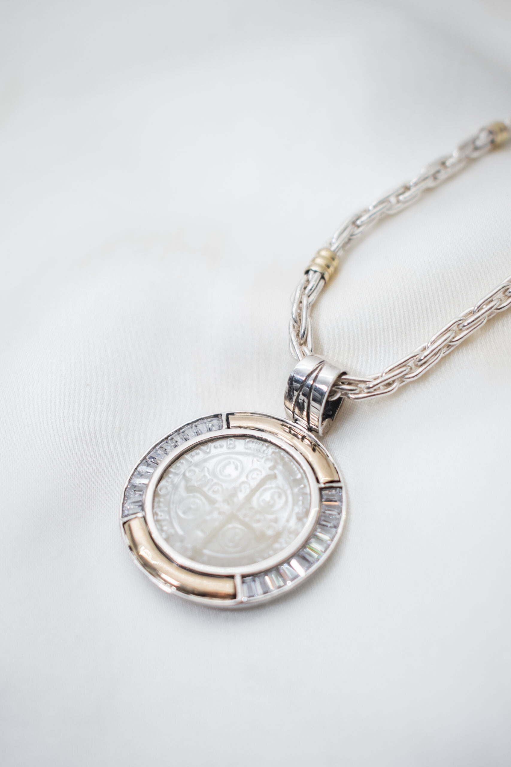 Conjunto de cadena en plata con apliques de oro y medalla de San Benito en plata, Nácar, oro y Circonias. Largo: 45 cm.