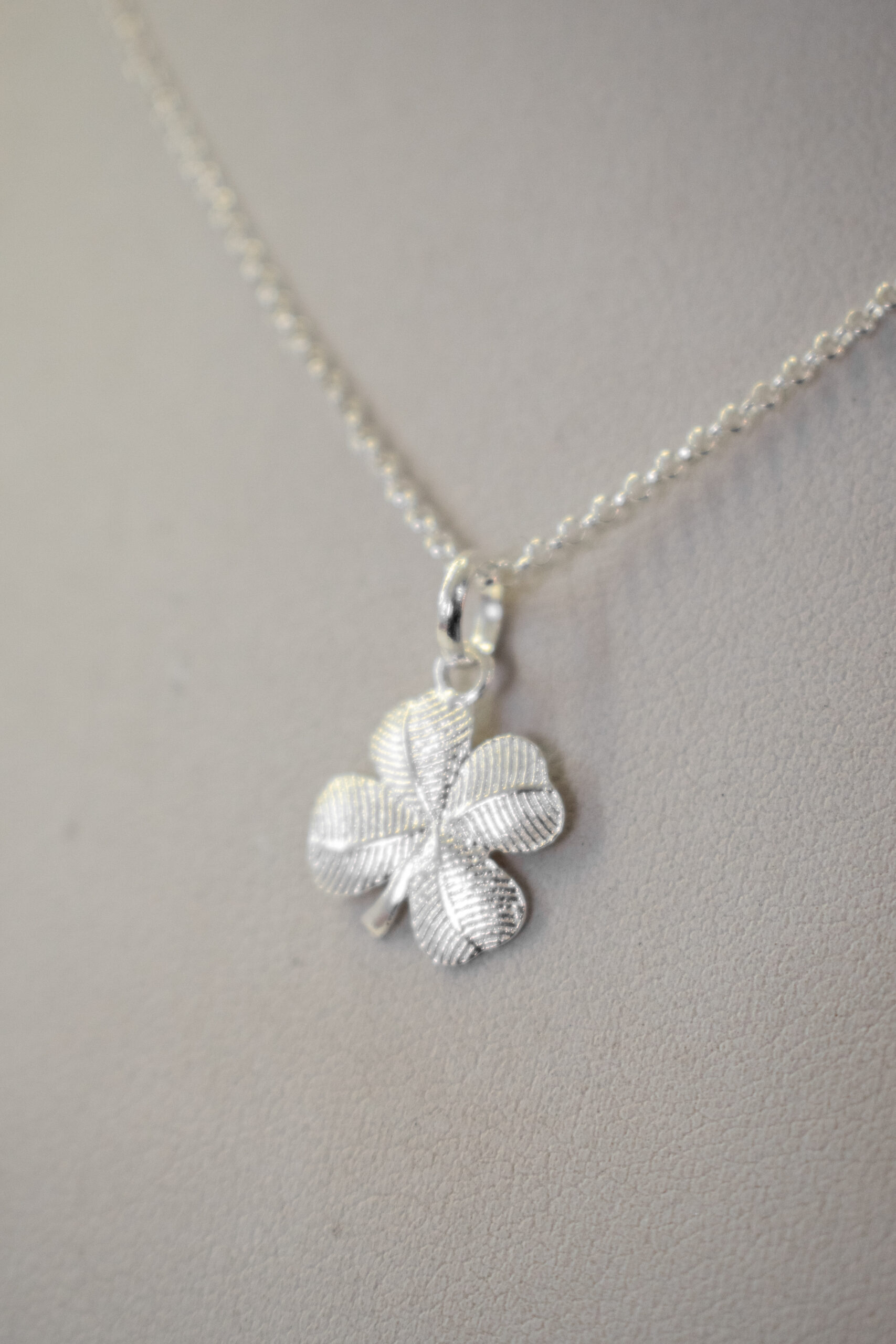 Dije de trébol de cuatro hojas con textura en plata.