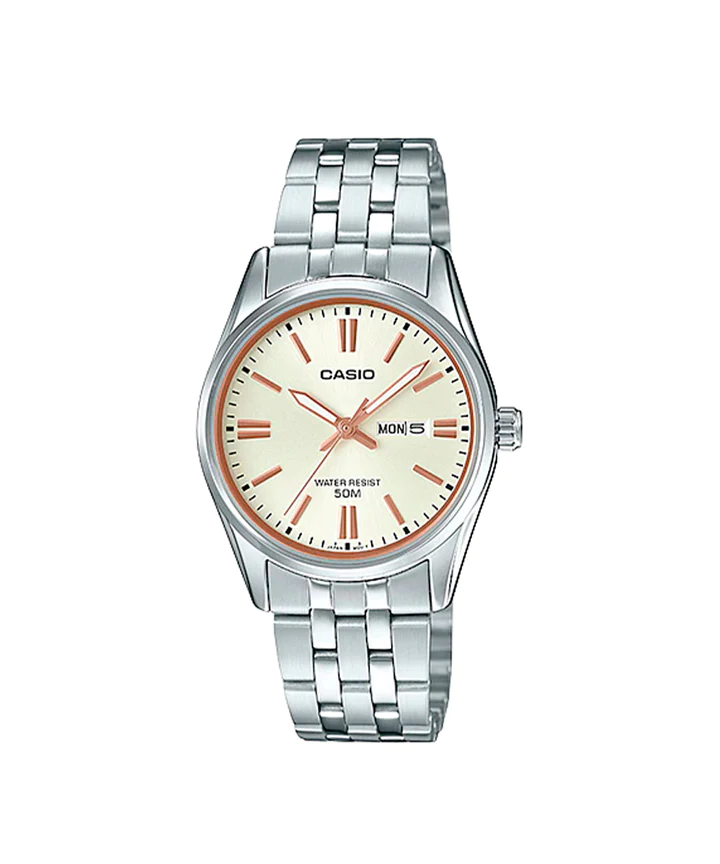 Reloj Casio de dama en acero color plateado. Esfera en color blanca. Resistente al agua.