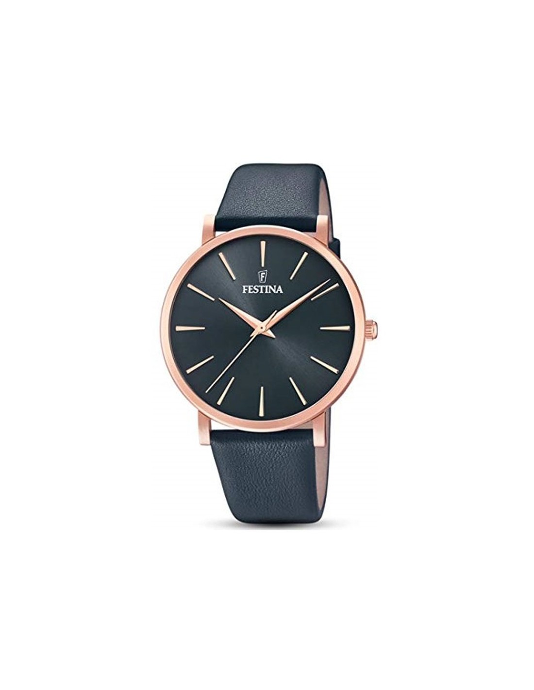 Reloj Festina de dama, con malla de cuero y esfera negra. Resistente al agua.
