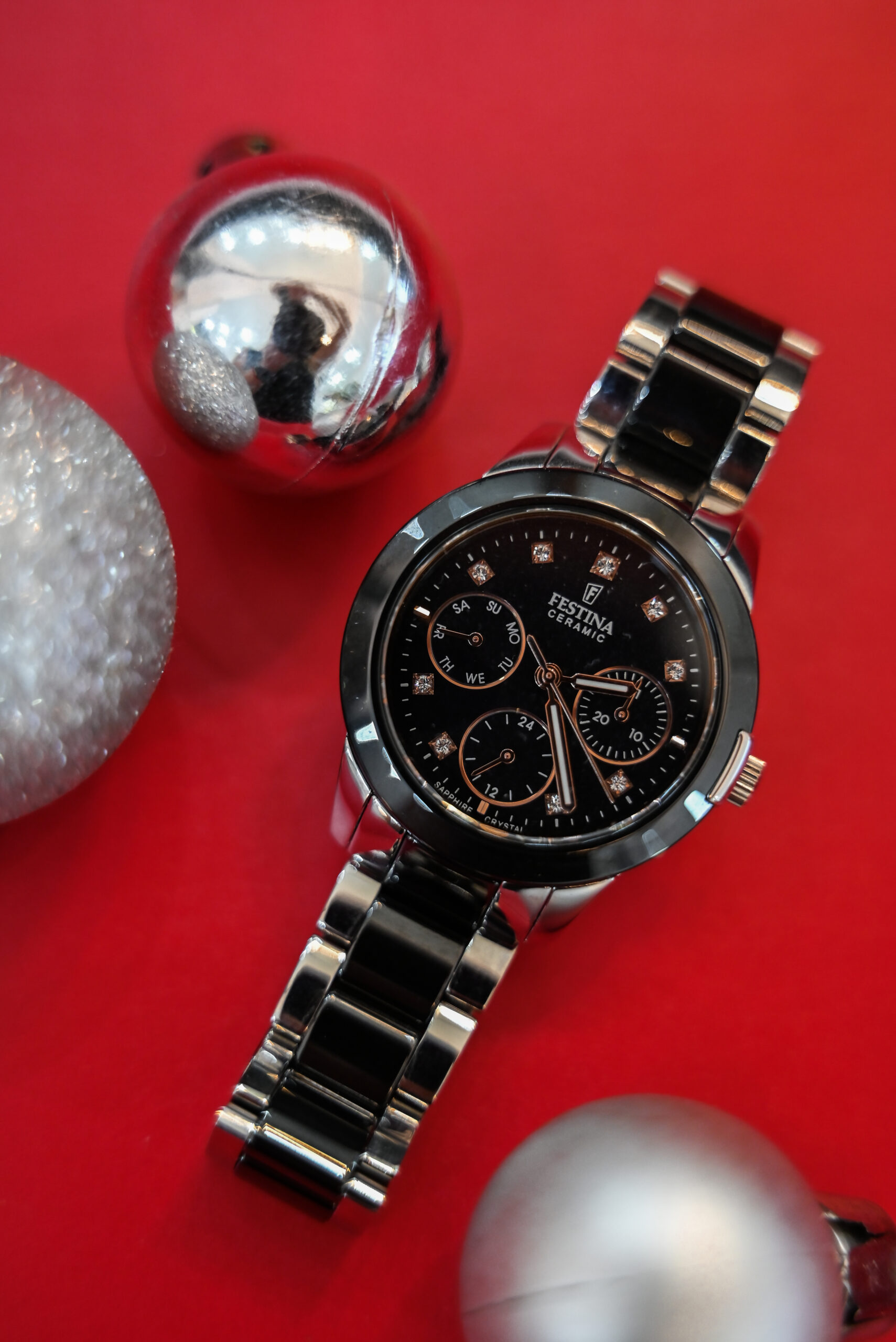 Reloj Michael Kors con malla negra y plateada + esfera negra y detalles dorados, de dama.