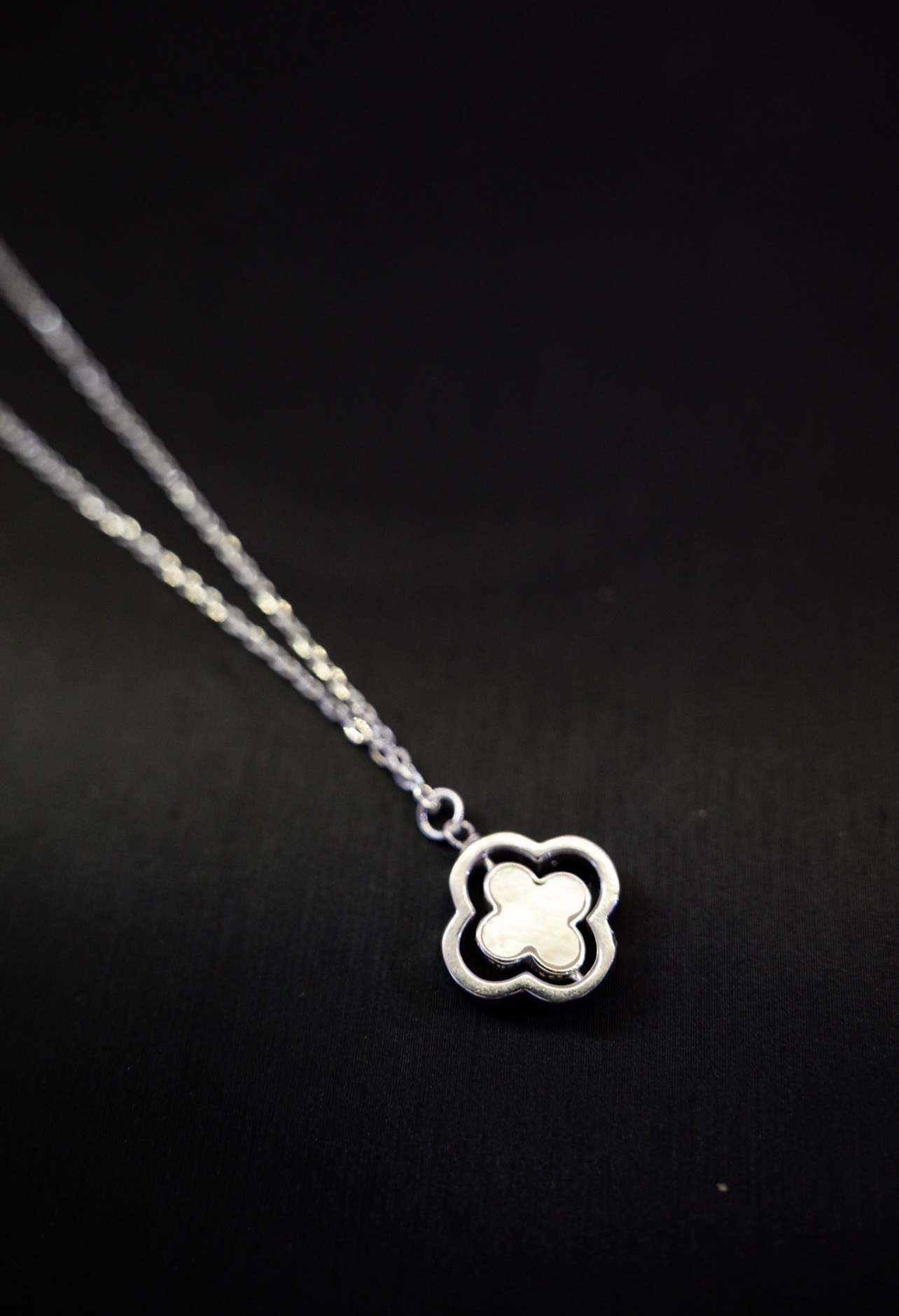 Conjunto de cadena de plata fina + colgante de trébol de 4 hojas en plata y nácar.